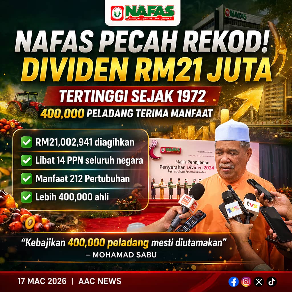 PETALING JAYA, 17 Mac 2026 – Pertubuhan Peladang Kebangsaan (NAFAS) mencipta sejarah baharu apabila mengumumkan agihan dividen berjumlah RM21,002,941 bagi tahun kewangan 2024, sekali gus menjadi yang tertinggi sejak penubuhannya pada tahun 1972.